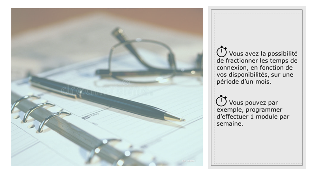 Si vous quittez la session pour ouvrir une autre application, une page web ou pour accèder à un document sur votre PC, le décompte du temps de formation sera interrompu. Ce sera le cas si vous ouvrez la calculatrice sur votre PC, par exemple.