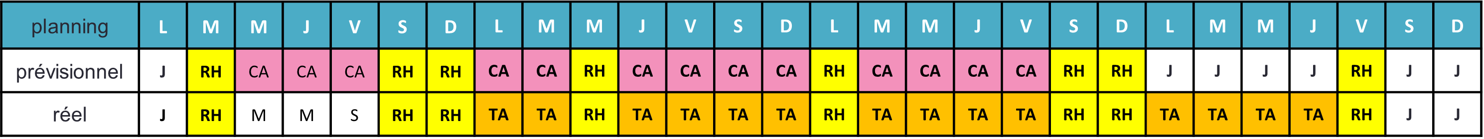 Un agent est en arrêt maladie au cours de sa période de congés ainsi que durant sa semaine de reprise, comme l’indique le planning ci-dessous.